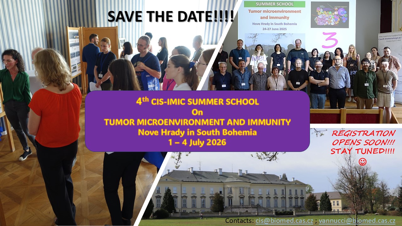 After the success of the previous summer schools, the Czech Immunological Society together with the Institute of Microbiology of CAS, v.v.i., is once again organizing the 4th summer school on tumor microenvironment and immunity. The event will take place from July 1 to 4, 2026 in the beautiful surroundings of Chateau Nové Hrady in South Bohemia - detailed travel information can be found in the first announcement poster.